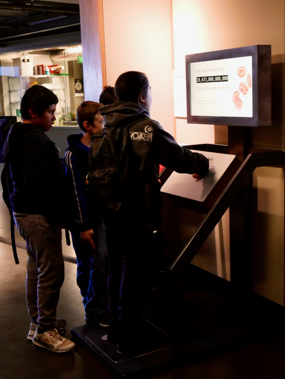 Description: The Blood-O-Meter was designed to answer a surprisingly complex question: How many blood cells are in the human body? Using a visitor’s weight, the exhibit calculates an approximate blood volume in liters, and then extrapolates the estimated number of red blood cells, white blood cells, and platelets within their body. These staggeringly large numbers—with the average person containing 20-30 trillion red blood cells—are displayed in their entirety, offering a visceral, visual representation of the body’s cellular makeup. By making the invisible visible, the Blood-O-Meter helps visitors grasp the astonishing scale and complexity of their own biology.